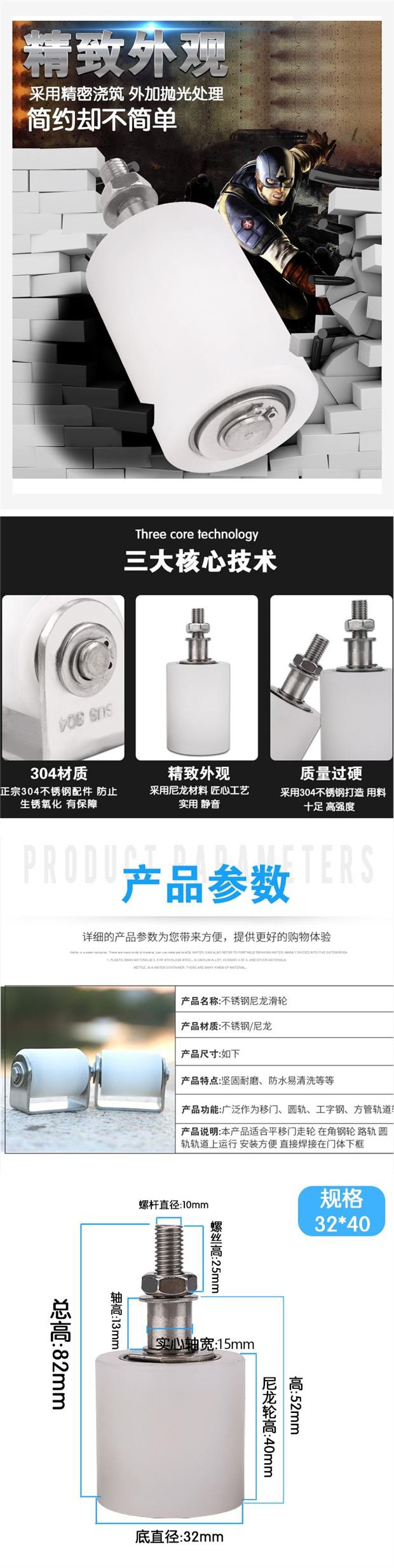 產(chǎn)品主要參數(shù): 規(guī)格:32*40 材質(zhì):SUS 304不銹鋼 總高:82MM 尼龍輪高:40MM